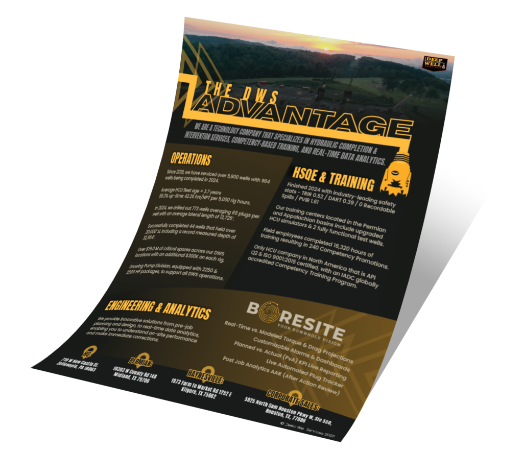 Deep Well Services (DWS) is an API/Q2 registered company specializing in competency-based training, real-time data analytics, and hydraulic completion & workover services.